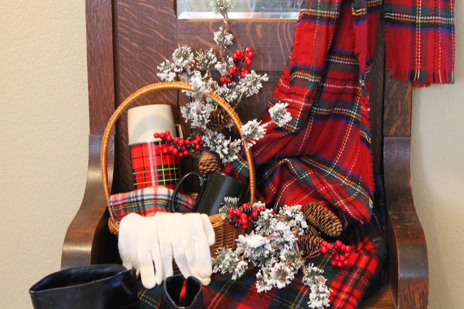 Today I have been busy getting some of my Christmas decorating done. I have half of the family room done, most of the front porch and finished the hall tree. I will be working more tonight trying to get as much done as possible. I don't even want to think about how many more rooms I need to do. I decided to do a plaid theme for the hall tree. I have eveything I will need for a little outing in the snow (minus my coat). I have my scarf, hat, gloves, boots and of course a thermos of hot cocoa.